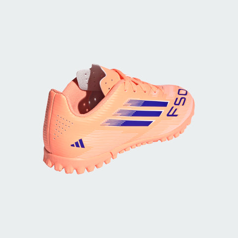 Trova la tua velocità per esprimerti davvero in campo. Prova l'emozione con le scarpe adidas F50 progettate per la velocità. Queste scarpe da calcio Club per bambini ti offrono comfort in movimento grazie alla tomaia sintetica leggera e alla linguetta perforata. Capovolgili e troverai una suola in gomma carrarmato che supporta il gioco veloce su erba artificiale.
